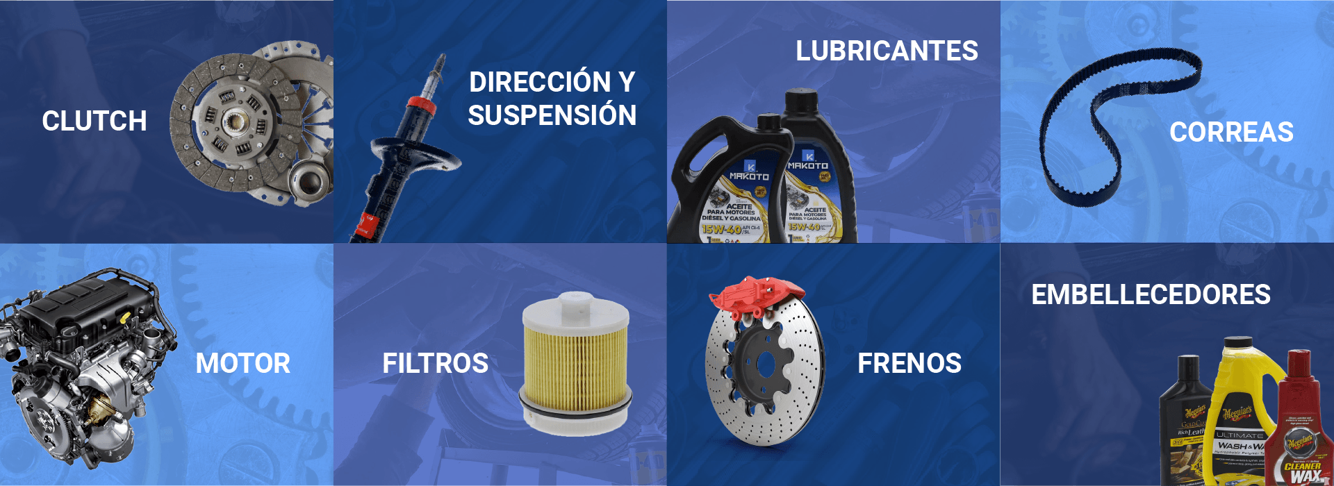 En nuestra tienda encontrarás todo lo que tu vehículo necesita para mantenerse en perfecto estado. Ofrecemos repuestos originales y de excelente calidad en categorías como refrigeración, motor, lubricantes, frenos, iluminación, filtración, eléctricos, dirección y suspensión, correas, clutch, carrocerías, caja de transmisión, baterías y accesorios.